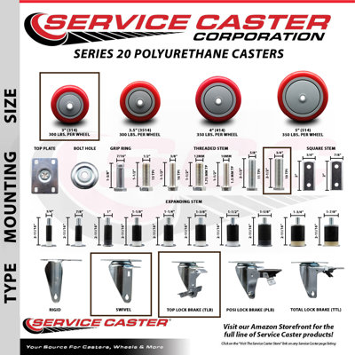 Service Caster 3 Inch_Poly Wheel Swivel 3/4 Inch_Threaded Stem Caster Set 2 Brakes in Maroon | 8" H X 8" W X 8" D